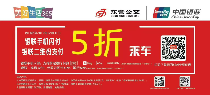 為倡導(dǎo)綠色低碳出行環(huán)境,讓市民充分享受到公交優(yōu)先發(fā)展的成果,自即日起至12月31日,市公交公司聯(lián)合銀聯(lián)再次推出便民服務(wù)舉措。市民使用銀聯(lián)手機閃付、云閃付APP二維碼或各銀行APP二維碼支付兩種支付方式,每用戶每種支付方式每天享受1次“5折乘車”優(yōu)惠(單筆最高優(yōu)惠1.99元);使用銀聯(lián)IC卡閃付每卡每天享受1次“7折乘車”優(yōu)惠。活動期間優(yōu)惠總額160萬元,先到先得,滿額為止。